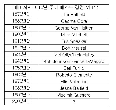 아래의 표는 세이버매트릭스의 대부 빌 제임스가 미국 야구역사에서 10년 주기별로 최고의 강견 외야수를 선정한 리스트입니다.