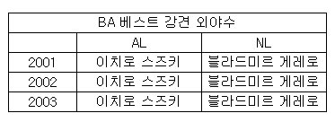 2000년대 초반 AL은 매리너스의 이치로가, NL은 당시 몬트리올 엑스포스 소속의 게레로가 감독들이 선정하는 BA 베스트 툴의 최고 강견 외야수를 독점했었습니다. 메이저리그 최고 강견 외야수는 AL은 이치로가 NL은 게레로가 양분하고 있는 구도였습니다.