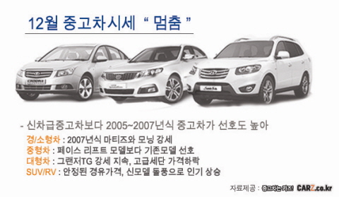 반면 베르나, 클릭, 프라이드 등의 소형차는 약세를 보이고 있는데, 특히 베르나 2007년식이 700만~780만원대에 거래되며 경차인 모닝 수준까지 내려온 상태다.