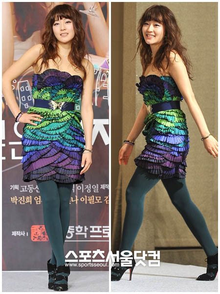 ▶ 박진희는? : 박진희는 마치 형형색색의 색종이를 오려붙여 만든 듯한 컬러풀한 드레스를 입었다. 여기에 나비 모양 장식의 벨트를 매치해 글래머러스한 몸매를 강조하고 화려함까지 더했다. 여기에 굵은 웨이브의 뱅헤어로 어려보이는 효과를 줬다. 심플한 느낌의 짙은 초록색 불투명 스타킹과 블랙 부티는 드레스를 더욱 돋보이게 했다.