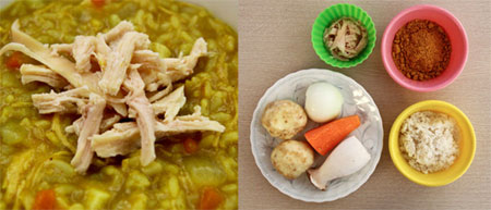 ▶ 닭고기카레죽 재료 2인분 기준 : 밥 1 공기(약 210g = 식품구성안 1인 1회분량), 닭가슴살 150g(1캔), 감자 1/2개, 당근 1/2개, 양파 1/2개, 버섯 1/2개, 카레가루 5 큰 술, 식용유 약간, 물 2컵 반(600ml)