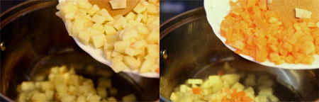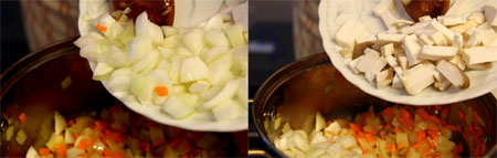 3. 감자와 당근이 어느 정도 익으면 양파와 버섯을 넣는다.