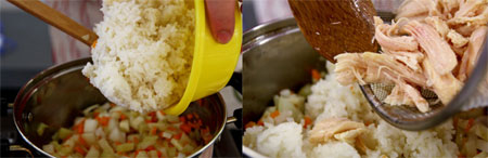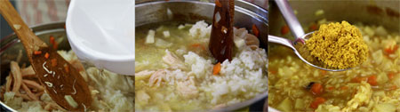 4. 야채가 익기 전 밥과 닭가슴살을 넣고 물을 부은 뒤 10분 정도 끓인다.