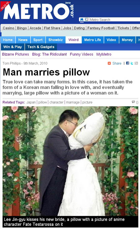 지난 8일 영국 일간지 '메트로(Metro)' 및 주요 인터넷 매체들은 "베개와 결혼식을 올린 남성이 등장했다"며 "그 주인공은 한국에 사는 남성 이진규"라고 소개했다.