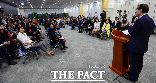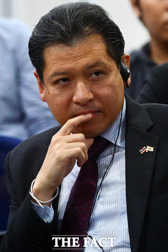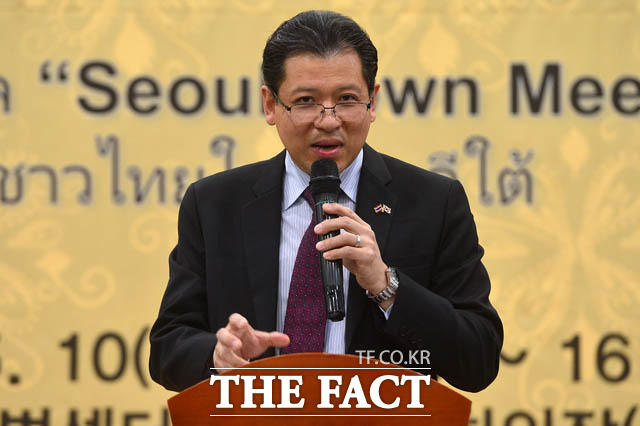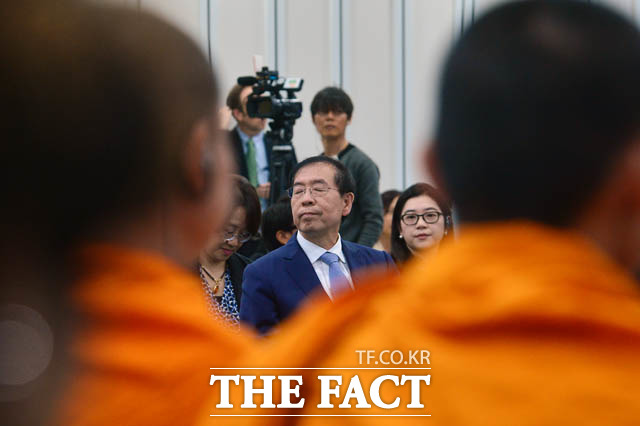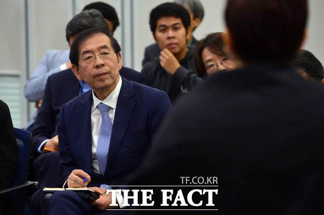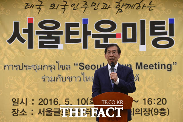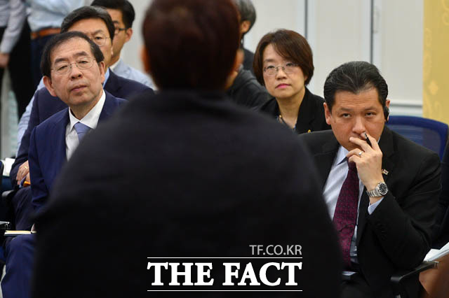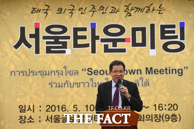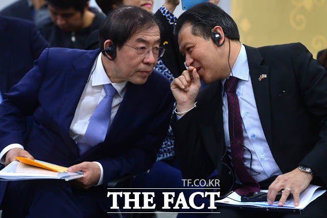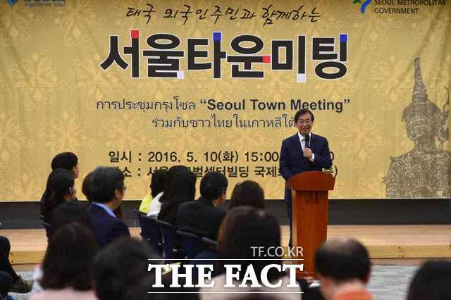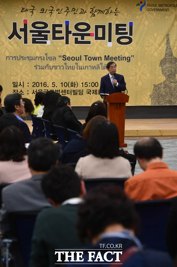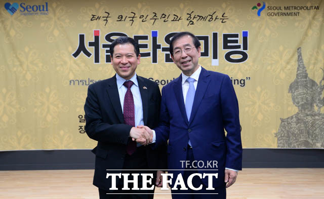 [더팩트 | 남윤호 기자] 10일 오후 서울 종로구 서울글로벌센터에서 열린 태국 주민과 함께하는 서울타운미팅 행사에 참석한 박원순 서울시장과 싸란 짜른쑤완 태국대사가 시정제안을 듣고 있다.
