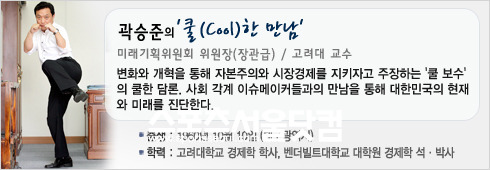 우리 시대의 리더와 이슈메이커들은 어떤 생각을 갖고 현재를 살고 있는가. 또 어떻게 미래를 설계하고 있는가. "따분한 보수는 가라"며 '쿨 보수'의 아이콘으로 떠오른 곽승준(52) 대통령 직속 미래기획위원회 위원장(장관급)이 변화와 개혁의 소용돌이 속에서 자신만의 색깔을 드러내고 있는 사람들과 특별한 만남을 갖는다. 20~40대가 주 독자층을 형성하고 있는 <더팩트>과 '쿨한 융합'이라는 목표를 향해 힘차게 나아가고 있는 곽승준이 펼치는 색깔 있는 대화는 이슈메이커들의 또 다른 면모를 볼 수 있는 새로운 장이 될 것이다.<편집자 주>