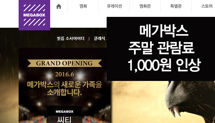 단, 이번 요금 인상은 메가박스 전체 82개 점 가운데 직영 30개 점에만 적용되며 위탁 운영되는 52개 점은 요금 변동이 없다.