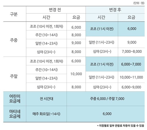 요금제 시간대는 단순해진다. 조조(10시 이전, 1회차), 주간(10~14시), 일반(14~23시), 심야(23시 이후) 등 총 4단계였던 시간대가 조조(11시 이전), 일반(11~23시), 심야(23시 이후)의 3단계로 간략하게 줄어든다.