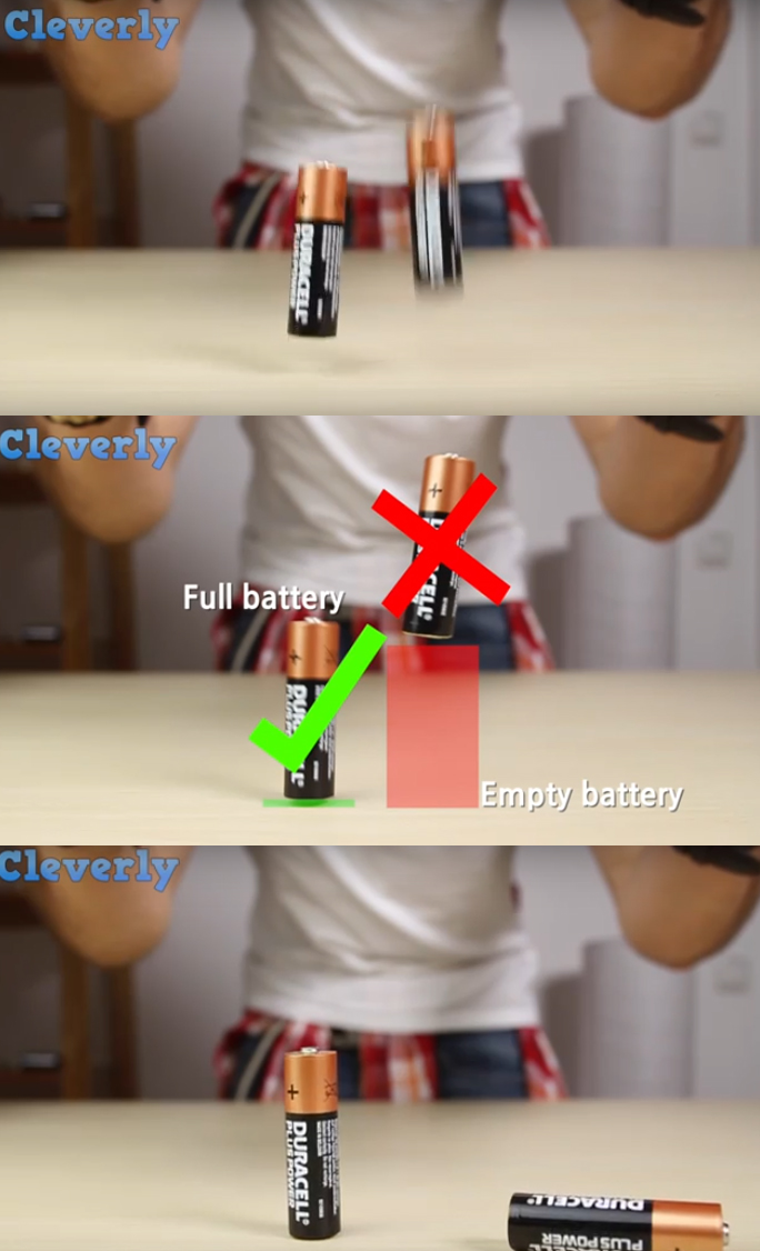 유튜브에 '간단하게 건전지 배터리 수명하는 방법' 영상이 올라왔다. 급하게 건전지가 필요할 때 건전지를 찾기 위해 시간을 소비하라 필요가 없다. 영상에서 소개한 방법을따르면 먼저 쓰다 남은 건전지 2개를 비슷한 높이에 두고 동시에 떨어 뜨린다. 이때 남은 건전지의 양이 많은 경우 더 적게 튀어오르는 반면 양이 적은 경우 더 많이 튀어오르는 현상을 볼 수 있다. 적게 튀어 오르는 건전지를 사용하면 되는 것이다.