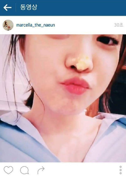 손나은은 사진을 삭제한 후 곧바로 다른 사진을 게재했습니다. 입술을 삐죽 내밀고 한층 더 귀여운 표정을 짓고 있는 손나은. 코 끝에 여전히 크림을 묻힌 상태였는데요. 알고보니, 방금 삭제했던 사진을 뽀얗게 보정 한 후 다시 게재한 것이었습니다.