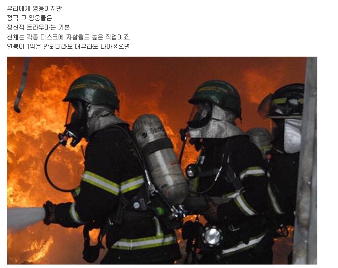게시글 속 사진은 소방관들이 불을 끄고 있는 모습이다. 게시자는 사진과 함께 "우리에게 영웅이지만 정작 그 영웅들은 정신적 트라우마는 기본 신체는 각종 디스크에 자살율도 높은 직업이죠. 연봉이 1억은 안되더라도 대우라도 나아졌으면" 이라는 글을 올렸다. 뿐만아니라 소방관들의 자살기사를 함께 올리며 소방관들의 정신적 스트레스를 강조하고 있다.