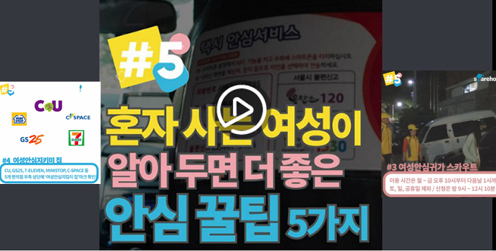 혼자사 는 여성이라면 혼자 집에 있을 때, 밤에 혼자 집가는 길 등... 무섭고 위험한 상황이 있을 수 있다. 여성안심 택배 서비스, 여성 안심귀가 서비스, 여성 안심지킴이 집까지 여성들을 위한 많은 것들이 준비되어 있는데 모르고 활용 못하는 사람들이 많다. '혼자사는 여성이 알아두면 좋은 안심 꿀팁' 영상보고 무료로 이용할 수 있는 안심 꿀팁을 활용해 보자!