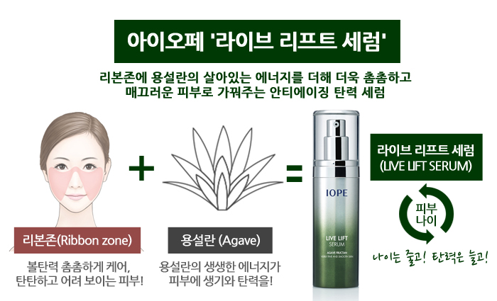 아이오페 라이브 리프트 세럼은 용설란의 생생한 에너지가 피부에 생기와 탄력을 부여하여 더욱 탄탄하고 어려 보이는 피부를 만들기에 탁월한 효과가 있다. 또한 사용 후 높은 탄력 수치를 기록할 만큼 이미 임상 실험을 통해서 그 효과가 명백히 입증되었다.