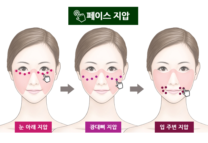 이는 리본존에 탄력을 부여할 뿐만 아니라 얼굴의 피로를 풀어주는 데도 매우 효과적이다. 페이스 지압은 리본존 부위 중 ‘눈 아래 → 광대뼈 → 입 주위’ 순으로 진행하는 것이 좋다.