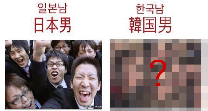게시자는 일본남 사진 아래 '자유분방하고 다채롭게 못생겼다' 라고 설명했으며, 한국남 사진 아래는 '모두가 똑같은 얼굴로 못생겼다'고 설명하고 있다. 즉 결론은 둘다 못생겼다는 것이다.