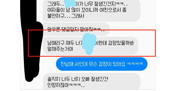오빠 여자친구의 반응에 친여동생은 "기분나쁘셨다면 죄송한데요. 저희는 남매 사이잖아요"라고 답한다. 그러자 여자친구는 굴하지 않고 "그래도 OO가 잘생긴건지 여자들이 넘 많아, 남매라도 감정이 있을까바 말해주는 거야"라며 오히려 여동생을 설득 한다.