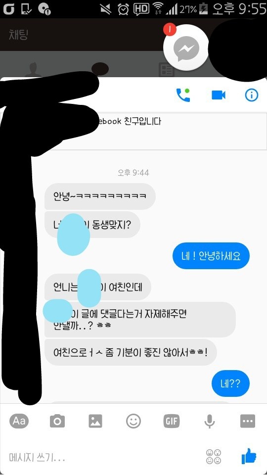 해당 글은 오빠를 둔 친여동생이 오빠의 여자친구와 나눈 대화 메시지를 캡처해서 올린 것이다. 오빠의 여자친구가 먼저 "ㅇㅇ동생 맞지?"라며 말을 건다. 이에 친여동생은 반갑게 인사하지만 여자친구는 "OO의 글에 댓글 다는거 자제 해주면 안댈까?"라며 "여친으로써 기분이 좋진않아서"라고 조언한다. 이에 여동생이 당황한 모습을 보이자 "너두 남친있어봐서 알지만 다른 여자가 멋지다고 하면 기분나쁘잖아"라고 말한다.