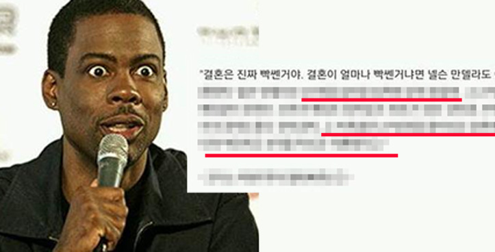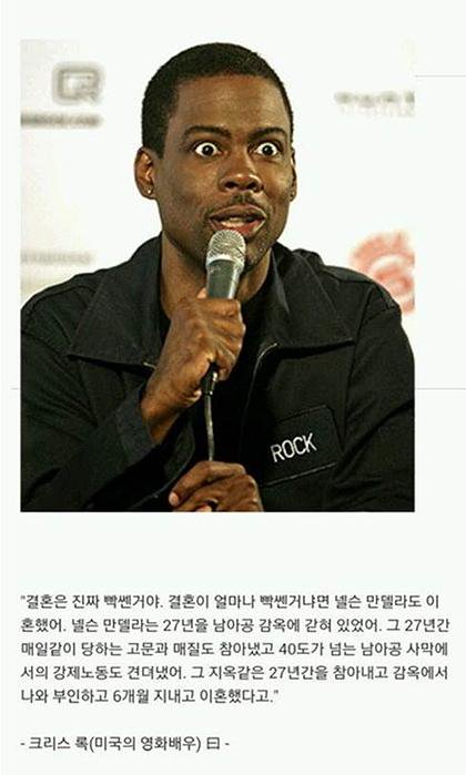 온라인 커뮤니티에 '결혼이 얼마나 빡센거냐면'이라는 제목으로 게시물이 올라왔다. 해당 게시물에는 미국 영화배우 크리스록의 말을 인용해 "결혼은 진짜 빡센거야, 결혼이 얼마나 빡쎈거나면 넬슨 만델라도 이혼했어. 넬슨 만델라는 27년을 남아공에 갇혀있었어"라고 남겼다. 이어 "그 27년간 매일 같이 고문 당하고 매질도 참아냈는데 40도가 넘는 남아공 사막에서의 강제노동도 견뎌 냈어"라고 남겼다. 또한 "그 지옥같은 27년을 참아내고 감옥에서 나와 부인하고 6개월 지내고 이혼했다고" 남겼다.