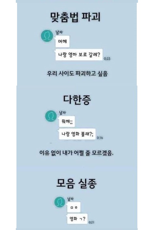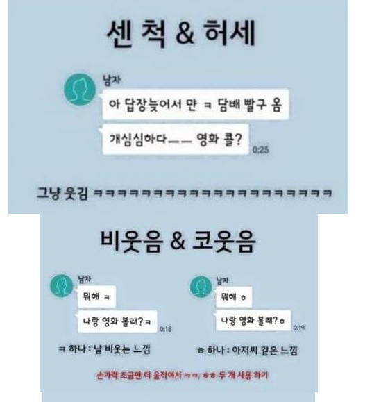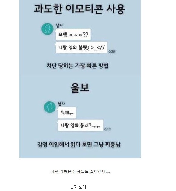 게시물에는 남자가 보낸 것으로 보이는 카톡의 대화가 캡처되어 있다. 첫번째는 센척과 허세로 여자들에게 쿨한척 센척하거나 허세부리는 남자에 대한 대화가 예시로 올라왔다. 이어 비웃음과 코웃음을 많이 하는 사람과 맞춤법을 잘못쓰는 남자, 다한증인것 처럼 말끝마다 ';;'을 붙이는 "뭐해;;, 나랑 영화볼래?;;"를 예시로 들었다. 이외에도 모음실종, 과한 이모티콘 사용, 'ㅠ'를 자주 사용하는 울보형 대화를 예로 올렸다.