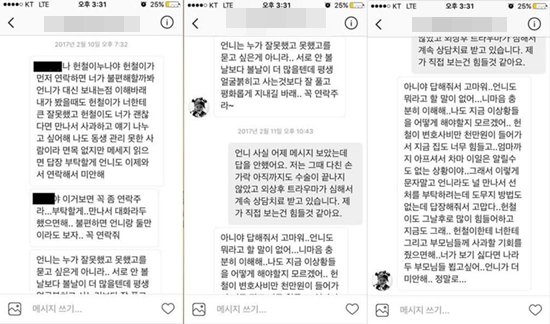 이어 B씨는 "A는 합의금을 받아내거나 할 생각이 전혀 없으며, 합의를 하고 싶다는 생각이 추호도 없는 상태"라면서 "또한 A에게 가해지는 욕설, 명예훼손 및 허위사실 유포 등등등 모든 것들 전부 캡처하고 있으며 선임한 변호사를 통하여 고소할 예정"이라고 설명하며 아이언의 친누나와 주고 받은 메시지를 공개했다.