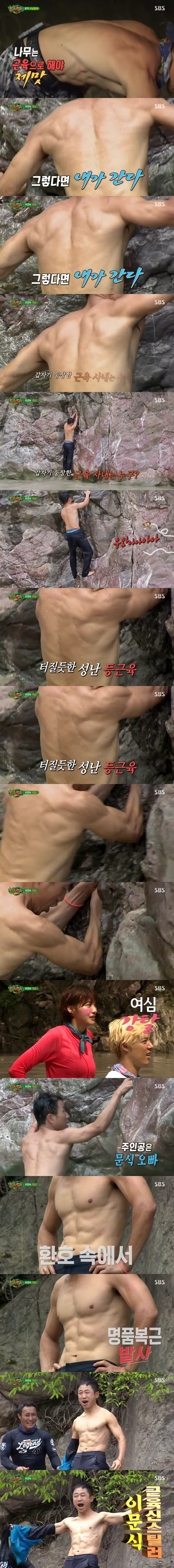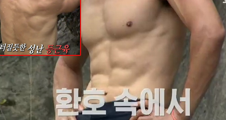 SBS'정글의 법칙'에 출연한 男배우가 완벽한 등근육과 복근을 뽐냈다.