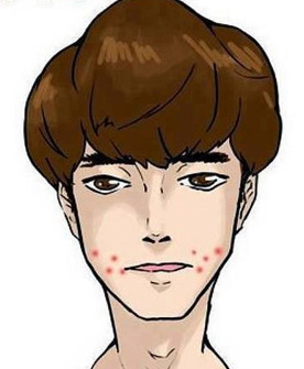 양 볼에 생기는 뾰루지는 호흡계 쪽이 좋지 않을 때 발생한다. 몸을 식혀주는 것이 좋기 때문에 찬 음식을 먹는 게 도움이 된다. 설탕을 줄이고 고기, 유제품, 술 등의 산성 음식을 피해 몸을 알칼리성으로 유지해야 한다.
