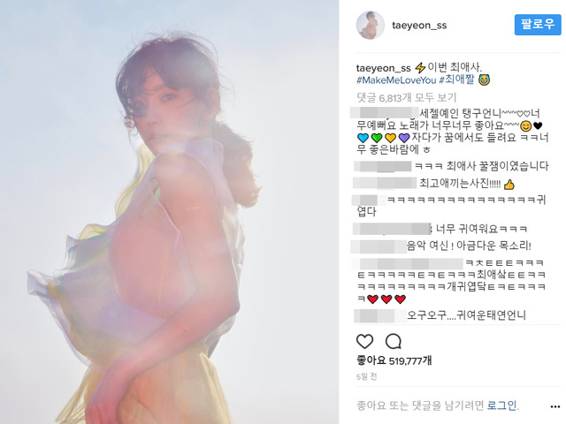 한편, 태연은 최근 신곡 '메이크 미 러브 유(make me love you)'로 활발한 활동 중이다.
