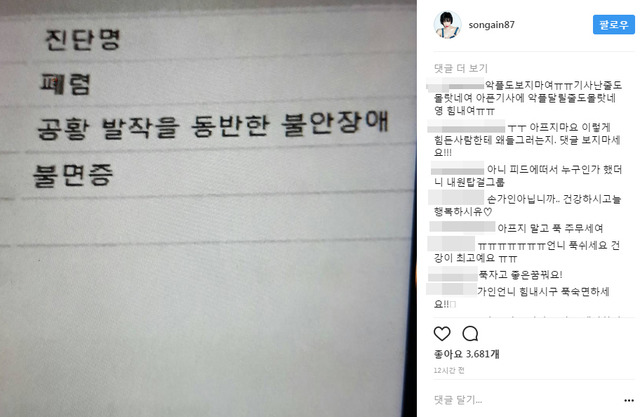 한편, 가인은 폐렴 외에도 공황 발작을 동반한 불안장애, 불면증을 겪고 있는 것으로 알려졌다.