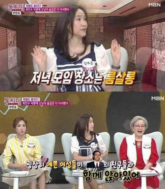 이어 강주은은 "(최민수가) 저녁에 약속 있다고 예쁘게 차려입고 가자고 했다"며 "저녁 모임 장소가 룸살롱이었다. 그때 나는 룸살롱이 뭔지 몰랐다. 처음 간 것인데 남편 친구들이 앉아 있고 너무 예쁜 여성들이 같이 앉아있었다"고 덧붙이며 출연진들을 경악하게 했다.