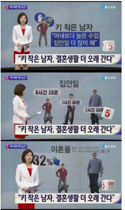 과거 영국매체 데일리메일은 "미국 뉴욕대 연구진이 부부 3033쌍을 분석한 결과 키가 작은 남자들은 평균이거나 큰 남자들에 비해 이혼률이 32% 낮았다고 밝혔다"고 보도했다.
