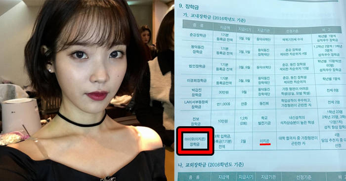 공개된 게시물에는 아이유의 모교인 '동덕여고' 학교 안내 팜플렛 '2017 학교생활 길라잡이'의 일부 내용이 담겨있다. 안내 팜플렛의 '교내장학금' 부문에서 '아이유(이지은)장학금'이 누리꾼들의 눈길을 끌고 있다.