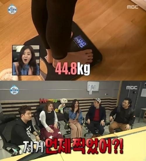 체중계에 올라선 한채아의 몸무게 44.8kg이 고스란히 카메라에 잡혔고, 스튜디오에서 이를 확인한 한채아는 "저걸 공개하면 어떻게 하냐"며 "언제 찍었냐"고 당황스러워했다.
