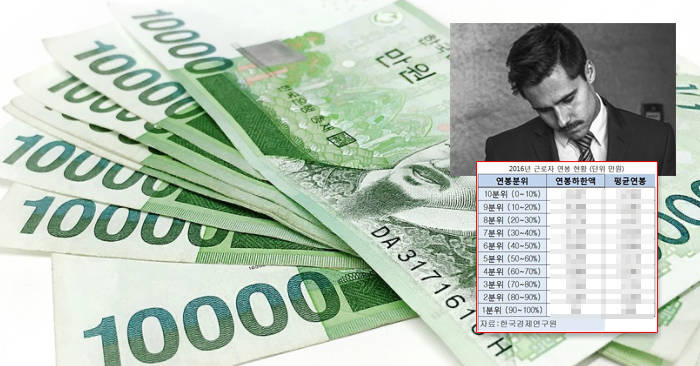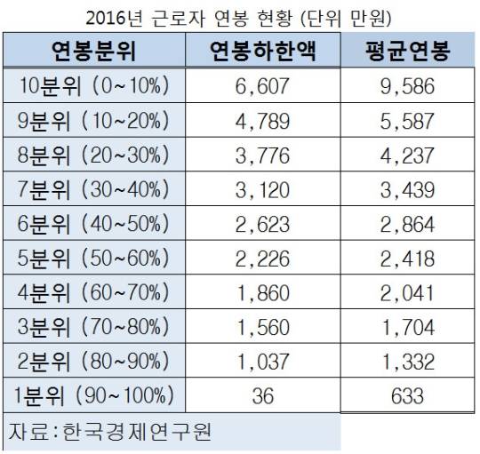2016년 연봉금액별 근로자수 분포는, 연봉 '1억원이상'은 43만명(2.8%), '8000만원∼1억미만'은 47만명(3.0%), '6000만원∼8000만원미만'은 107만명(7.0%), '4000만원∼6000만원미만'은 224만명(14.5%), '2000만원∼4000만원미만'은 601만명(39.0%), '2000만원미만'은 521만명(33.8%)으로 분석됐다.