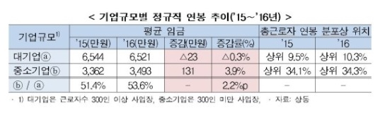 2016년 우리나라 대기업 정규직 근로자 평균 연봉은 6521만원으로 중소기업 정규직 3493만원 보다 두 배 가까이 높은 것으로 조사됐다. 2015년 대비 대기업 정규직의 평균연봉은 23만원 감소했다. 반면 중소기업 정규직의 평균연봉은 131만원 올라 과거에 비해 대기업 중소기업 격차는 소폭 줄었다.