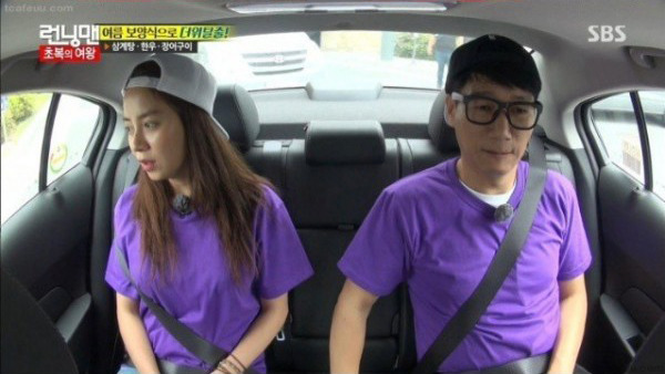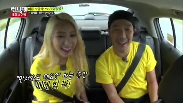 런닝맨에 출연한 여자 연예인들은 안전벨트를 어깨가 아닌 팔 위쪽이나 배 쪽으로 내려서 매고 있는 모습을 보이고 있다.