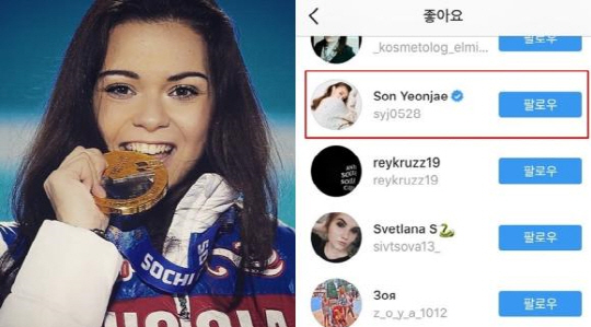 손연재는 27일(이하 한국시간) 러시아 피겨스케이팅 선수 아델리아 소트니코바의 팬 인스타그램 계정을 찾아 2014 소치 동계올림픽에서 딴 금메달을 물고 기뻐하는 소트니코바 사진에 '좋아요'를 눌렀다.