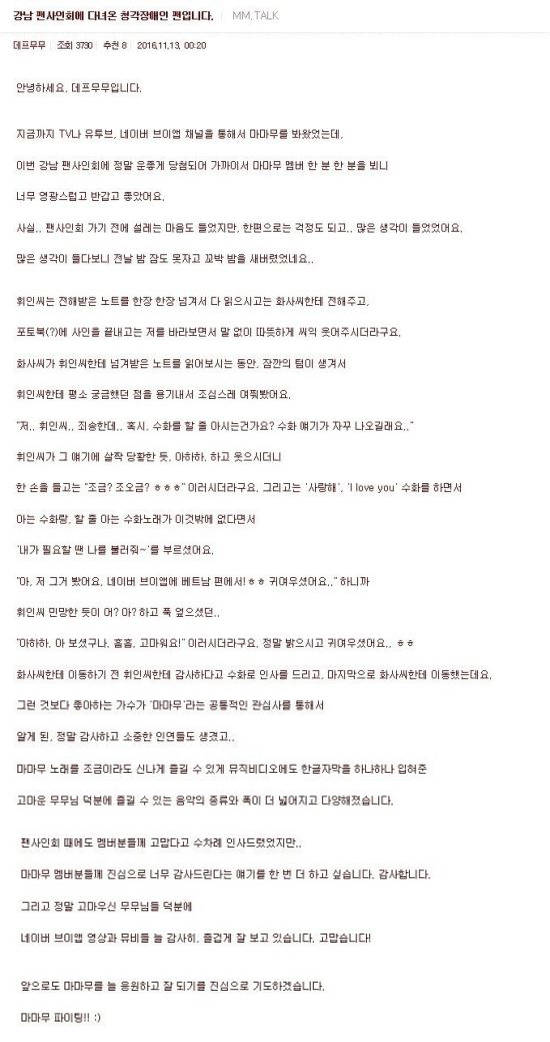 영상은 과거 강남 핫트랙스에서 진행된 마마무의 팬사인회 현장이다. 마마무의 멤버 휘인이 한 청각장애인 팬과 수화로 대화를 나누는 모습이 영상에 담겼다. 휘인은 자리에서 일어나 팬의 목소리에 귀 기울이고 입모양을 또박또박 보여드리며 조금 아는 수화들을 동원해 팬과 대화를 나눴다. 마마무의 또 다른 멤버 화사는 휘인한테 배워둔 '감사합니다'라는 수화를 하고 팬을 따스하게 안아주어 더욱 감동을 줬다.