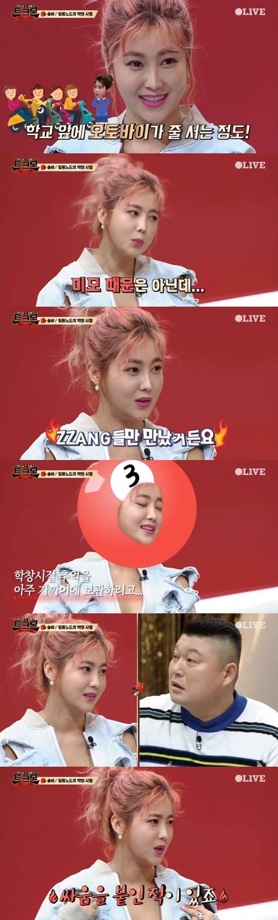 이날 출연한 솔비는 학창시절에 대해 "학창 시절에 학교 앞에 오토바이가 기다리고 있었다"라며 "학교에 저를 보러 사람들이 몰려왔다. 미모 때문은 아니다. 학창 시절에는 짱들만 만났다"라고 고백했다.