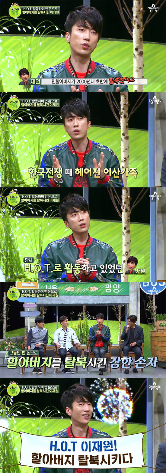 과거 방송된 채널A '이제 만나러 갑시다'에 패널로 출연한 H.O.T. 이재원은 자신의 할아버지에 얽힌 이야기를 전했다. 이재원은 "친 할아버지가 2000년대 초에 탈북했다. 아버지가 5~6살 때 한국전쟁이 나서 할아버지와 헤어졌다"며 "아버지에게 탈북 브로커로부터 쪽지가 왔다. 아버지가 돈이 상당히 많이 든다고 해서 혼자 걱정하시더라. 2000년 당시는 내가 H.O.T.로 활발히 활동할 때라, 내가 돈을 드려 모시고 왔다. 당연히 모시고 와야 한다고 생각했다. 할아버지가 언 두만강을 걸어서 건너셨다. 아버지가 중국에 가서 모시고 왔다"고 말했다. 이에 출연자 모두 이재원의 효심에 감동했고, 프로그램의 출연자이자 탈북자인 한송이씨는 "아이돌이 돈을 대 탈북을 시키다니 완전 대박"이라며 놀라워했다.