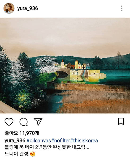 지난 4일 걸스데이 멤버 유라는 "볼링에 푹 빠져 2년 동안 완성 못 한 내 그림. 드디어 완성!"이라는 글과 함께 사진을 게재해 근황을 전했다. 유라가 그린 풍경화는 한눈에 봐도 수준급 실력임이 확연하게 드러난다. 유라 풍경화의 색채와 표현력이 전문가 수준이다. 이어 공개한 사진은 유라가 자신이 그린 그림 앞에서 뽀뽀하는 표정을 짓고 있다.
