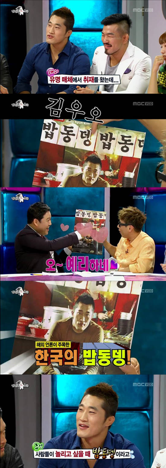 또한 김동현의 이름에 대한 에피소드는 최근에도 화제가 되었다. MBC '라디오스타'에서 김구라는 김동현에게 "왜 별명이 '한국의 밥동뎅'이냐. 그 의미가 무엇이냐"라고 물었고 그는 "외국 유명 매체에서 취재를 왔는데 한국적인 분위기에서 사진을 찍고 싶어 했다. 그래서 포장마차를 갔는데 김밥, 우동, 오뎅의 앞 글자가 잘려 '밥동뎅'으로 나왔다"라고 설명했다. 이어 그는 "그래서 사람들이 놀리고 싶을 때 나를 '밥동뎅'이라고 부른다"라며 폭소케했다.