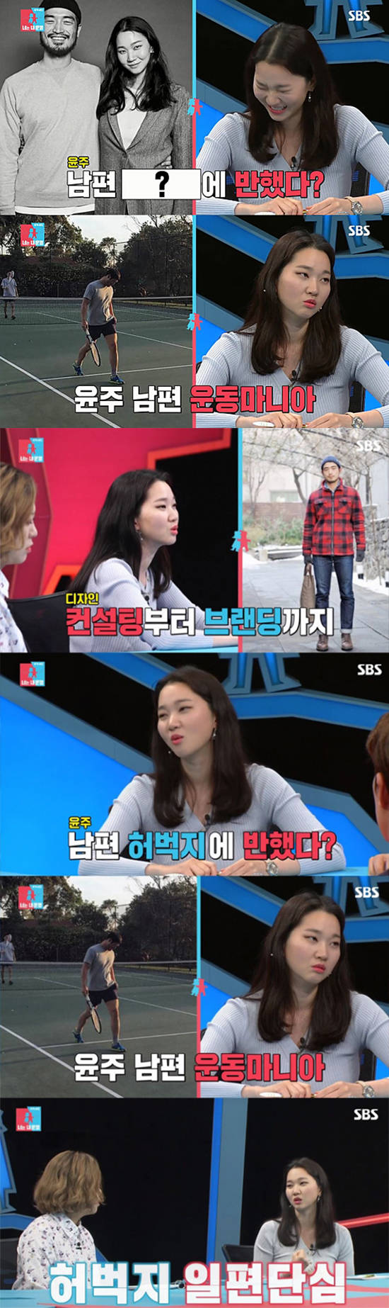 과거 SBS '동상이몽'에서 장윤주가 스페셜 게스트로 출연했다. 장윤주는 "남편이 자신의 브랜드를 가지고 있으면서 디자인 컨설팅을 한다"고 소개했다. MC들은 남편의 어느 부분이 제일 좋았냐는 물음에 장윤주는 웃으면서 "결혼 전 남편을 만나고 호감도가 급상승한 것은 허벅지다. 허벅지를 제일 좋아한다"고 솔직한 답변을 전했다. 이에 다른 게스트들도 자신들이 좋아하는 부위를 말했고 이에 서장훈은 "어디 고깃집인 줄 알았다"고 말해 웃음을 자아냈다.