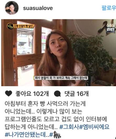 예쁜 미모로 주목받는 강릉 MBC아나운서 배수빈은 자신의 SNS에 방송에 출연한 캡처화면과 함께 글을 남겼다. 해당 사진은 SBS '생활의 달인' 방송화면이다. 배수빈은 "아침부터 혼자 빵 사먹으러 가는게 아니었는데.. 이렇게나 많이 보는 프로그램인줄도 모르고 겁도 없이 인터뷰에 답하는게 아니었는데.. #그회사#엠비씨에요#나가면안됐는데..#"라는 글을 올렸다.