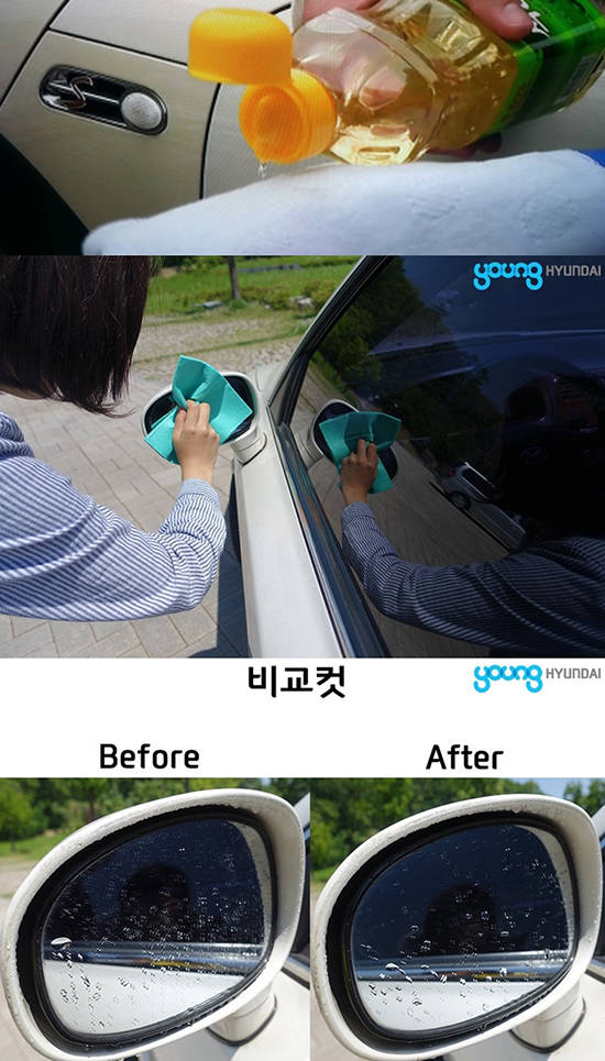 운전 시 전면 유리뿐 아니라 사이드 미러도 잘 보여야 시야 확보가 잘 된다. 이럴 땐 식용유를 유리에 바른 다음 마른 수건으로 잘 닦아주면 된다. 이 이유는 물과 기름이 섞이지 않는 원리가 적용되기 때문에 창문에 떨어진 물방울이 맺히지 않고 바로 흘러내린다.