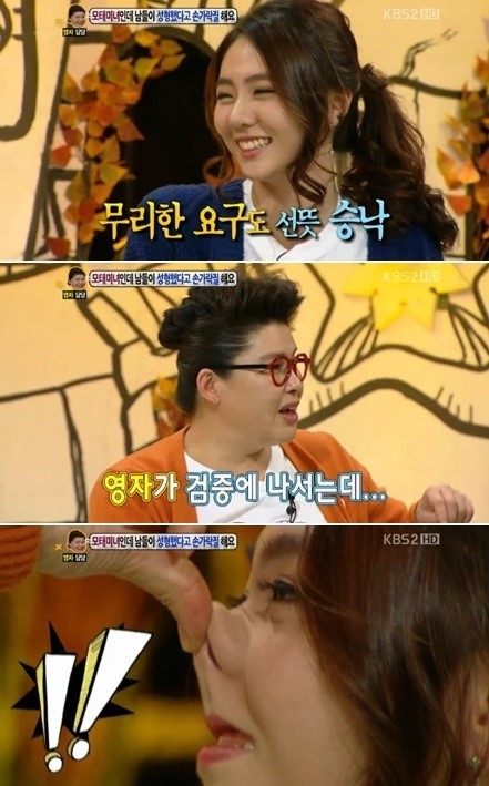 그는 등장부터 예쁜 얼굴로 사람들의 시선을 사로잡았다. MC 이영자는 "코가 너무 높아서 오해 받을 만하다"며 "직접 내가 코를 들춰봐도 되겠느냐"라고 물으며 주인공의 코로 돼지 코를 해 웃음을 자아내게 했다.