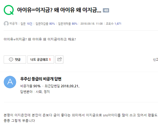 아이유의 인스타그램 아이디도 @dlwlrma인데 이지금을 영어로 쓴그대로다. 아이유가 자꾸 본명을 다르게 활동하는 것에 대해서 포털 질문게시판에 올라오는 등 관심이 집중되고 있다.