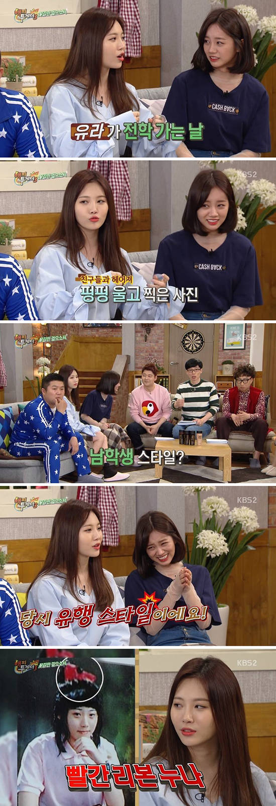 과거 사진 공개에 당황한 유라는 "해명을 하고 싶다. 전학가는 날이어서 세 시간이나 울어서 부었다"라며 "헤어스타일 역시 다 당시 유행했던 스타일이었다. 실물이 훨씬 나았다"라고 설명했다.