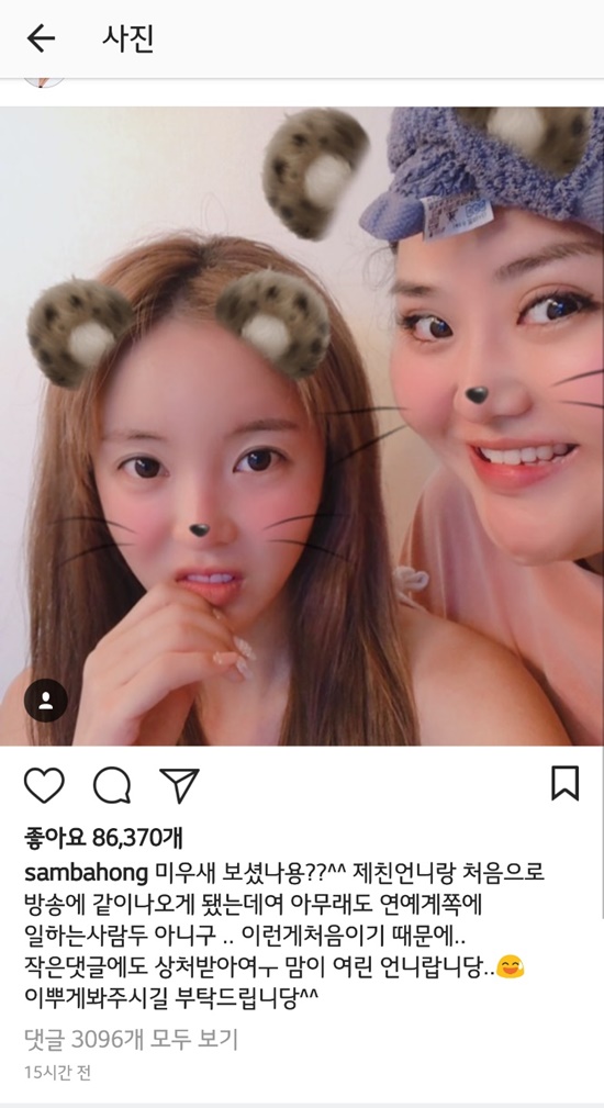 그는 먼저 "미우새 보셨나요? 제 친언니랑 처음으로 방송에 같이 나오게 됐는데요"라며 운을 뗐다. 이어 그는 "(언니가) 아무래도 연예계 쪽에 일하는 사람도 아니고 이런 게 처음이기 때문에"라며 "작은 댓글에도 상처받아요. 맘이 여린 언니랍니다"라고 처음 방송에 출연한 언니를 걱정하는 모습을 보였다. 또한 그는 "이쁘게 봐주시길 부탁드립니다"라고 덧붙이며 언니를 사랑하는 마음 씀씀이를 드러냈다.
