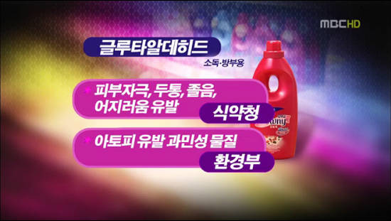 소독용과 방부제로 사용되는 글루타알데히드는 독성이 강해서 모든 점막을 자극하고 두통, 졸림, 어지러움 등을 유발한다. 장시간 노출되면 접촉성 피부염, 천식 등을 유발할 수 있다.