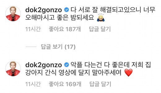 또 다른 게시물에 악플이 달리자 도끼는 "악플을 다는 건 좋은데 저희집 강아지 간식 영상에는 달지 말아 주세요♥"라고 하며 재댓글을 남겼다. 이를 두고 네티즌들은 "끊임없이 조롱하고 있다", "거만함이 끝이 없다"라며 부정적인 의견을 내놓고 있다.